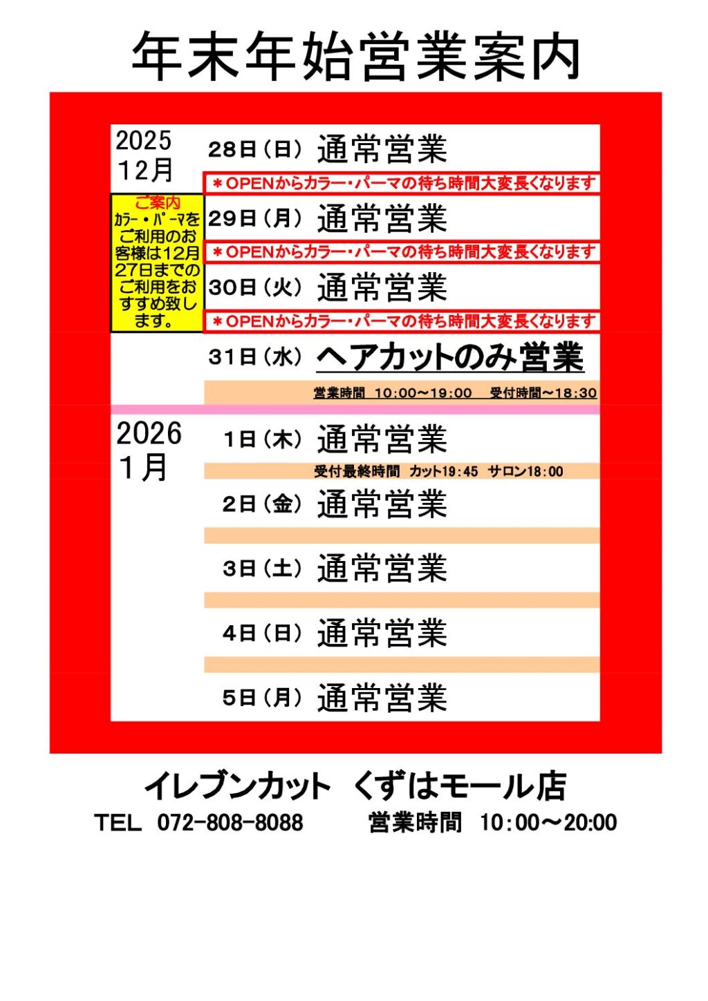 - 2025/11/17 くずはモール店 2025~2026年末年始営業案内