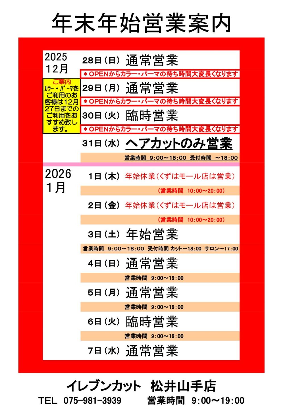 - 2025/11/17 松井山手店 2025~2026年末年始営業案内