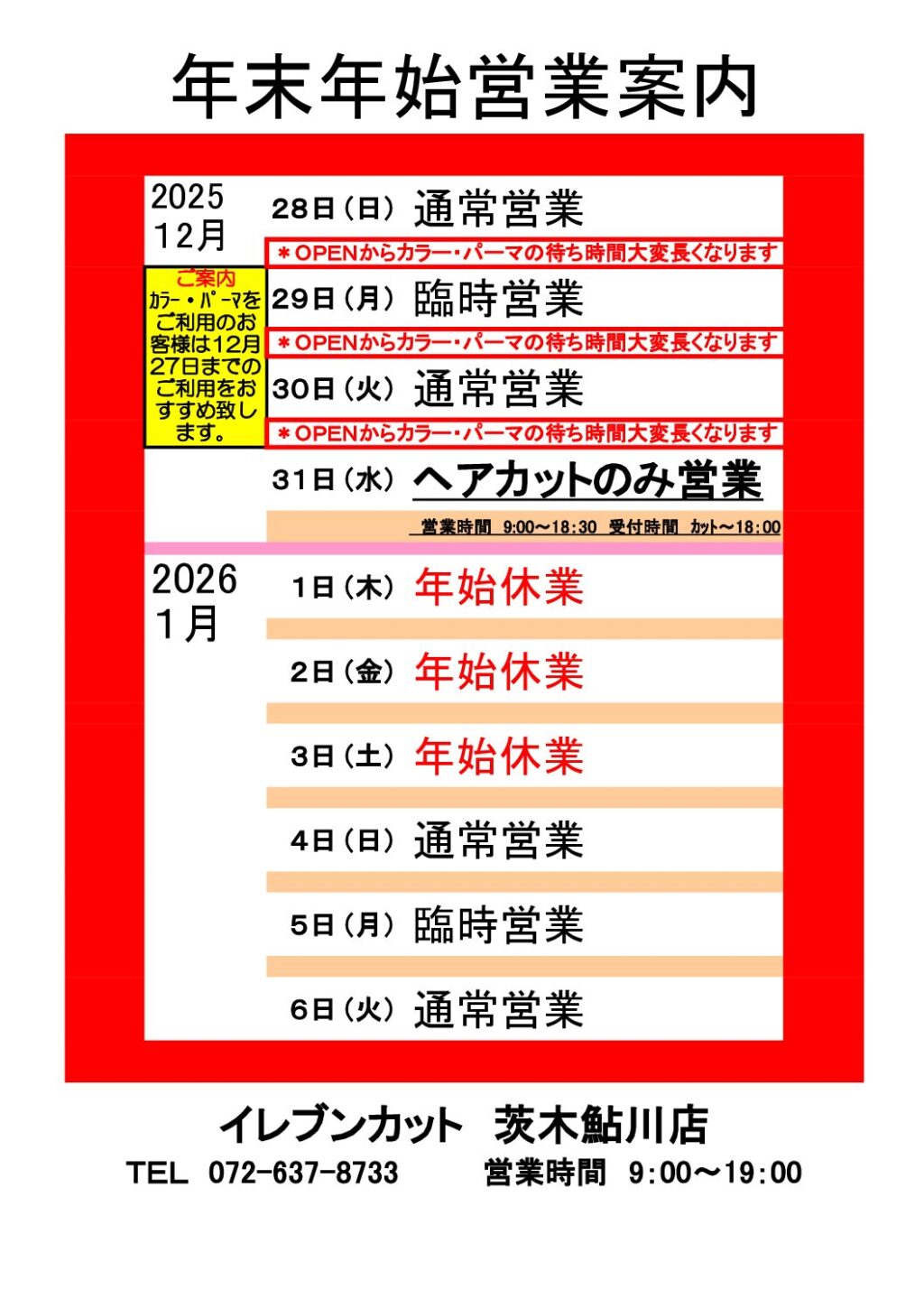 - 2025/11/17 茨木鮎川店 2025-2026年末年始営業案内